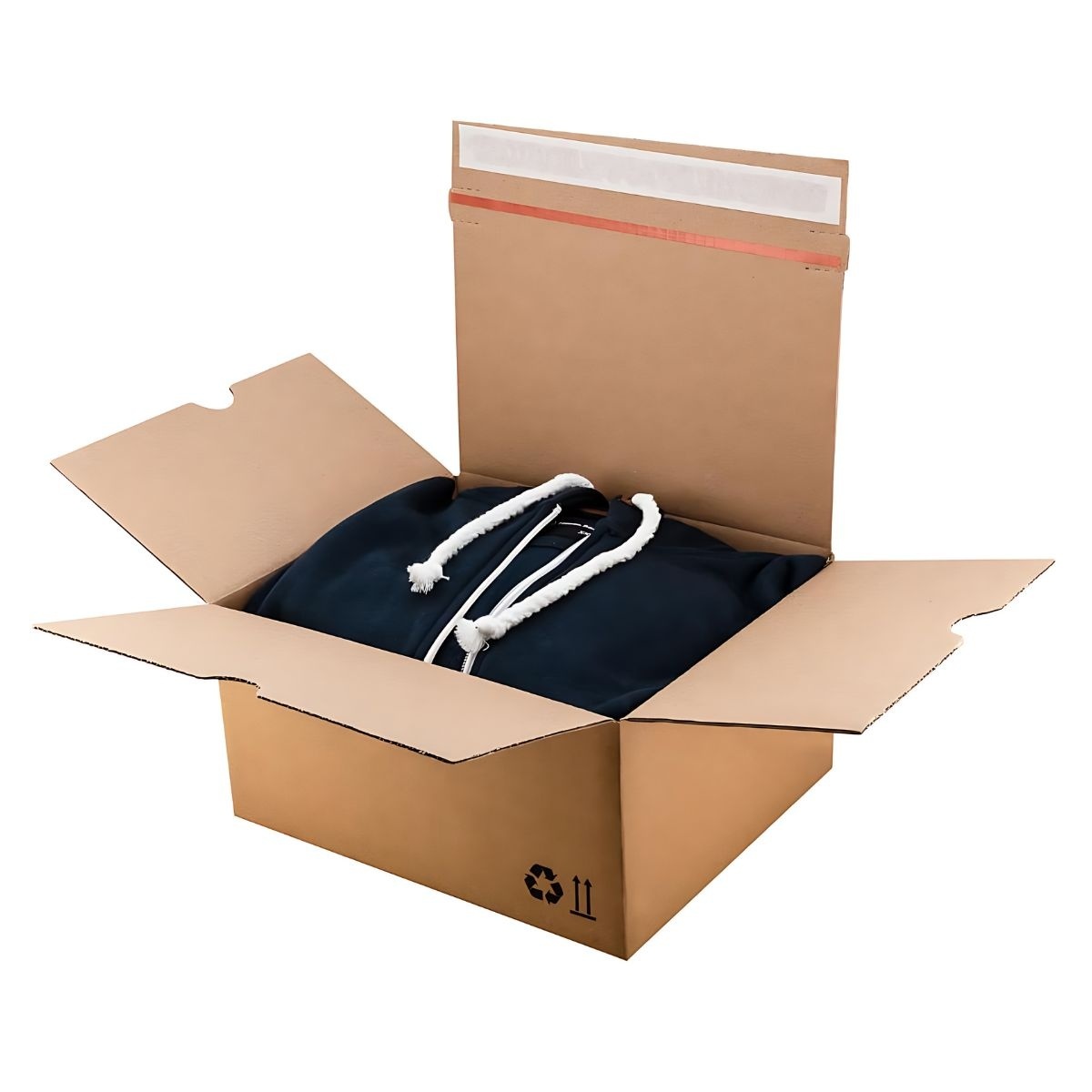 Nos boîtes d'expédition sont dotées d'un fond automatique. Cela signifie que l'assemblage des boîtes nécessite peu de travail. Le "système de verrouillage automatique" du fond vous permet de sécuriser la boîte en un rien de temps. Vous n'avez donc pas besoin de ruban adhésif pour fixer le fond. La partie supérieure est munie d'un bord adhésif en standard. Une fois que vous avez emballé les marchandises dans la boîte, vous pouvez la fermer et la fixer à l'aide du bord adhésif mentionné ci-dessus.