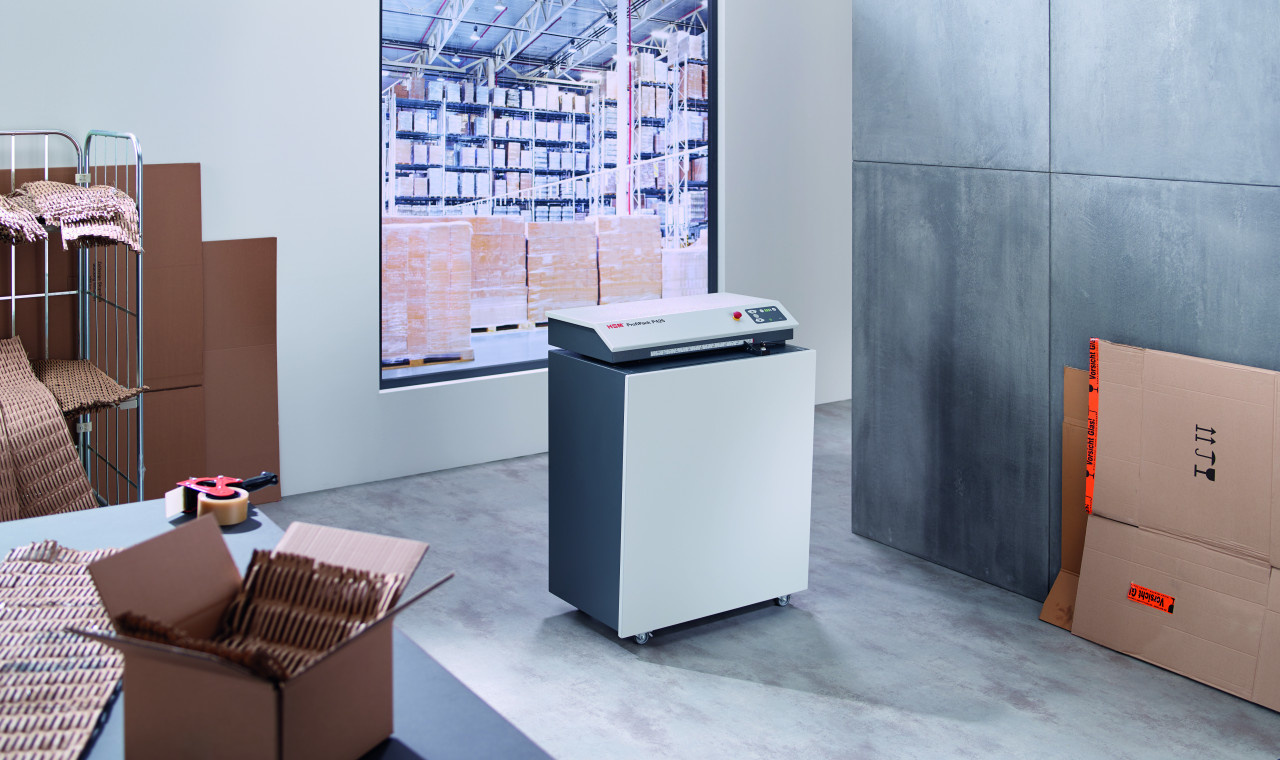 La machine est capable de transformer rapidement et facilement de grandes quantités de carton en tapis de rembourrage ou en matériau de remplissage enroulé.