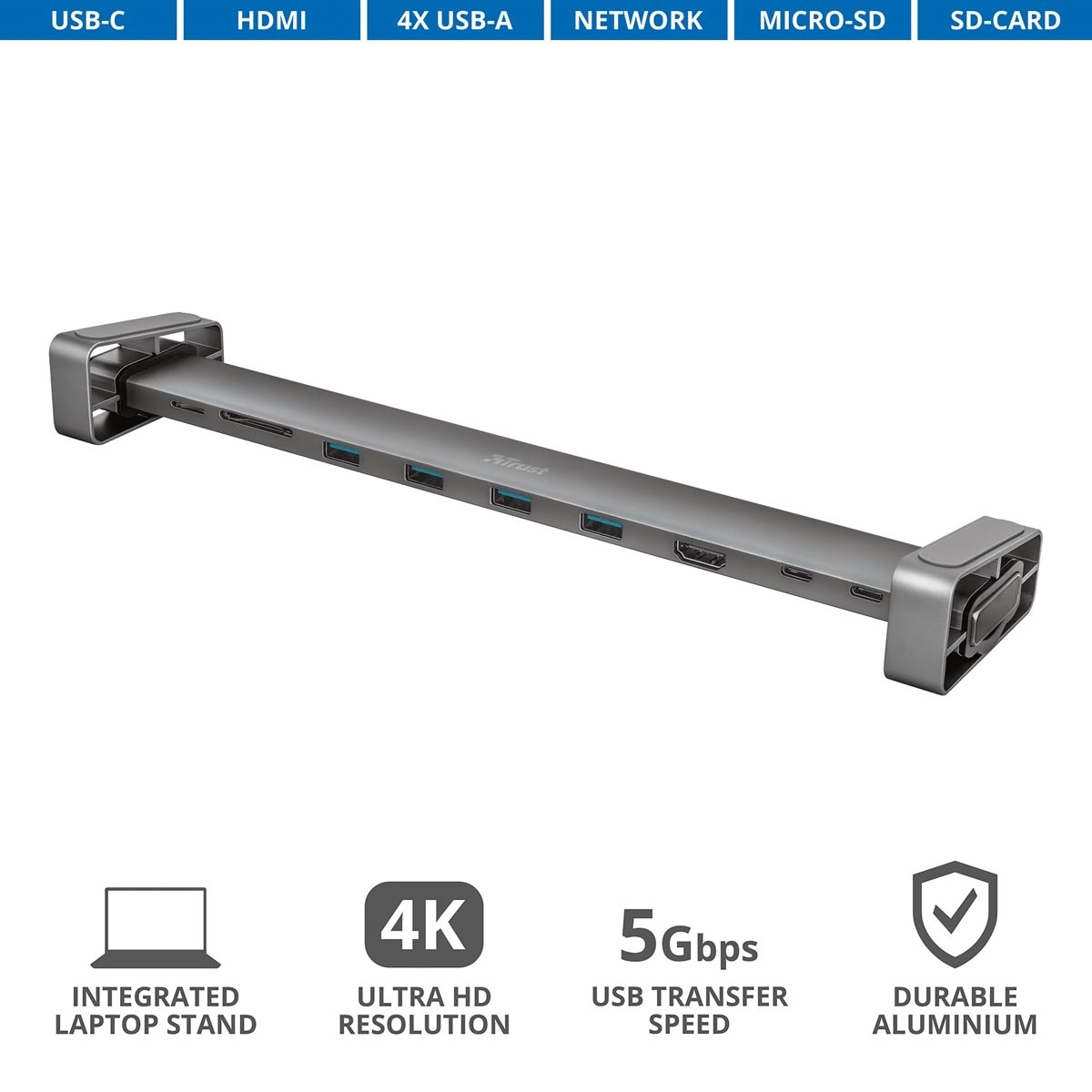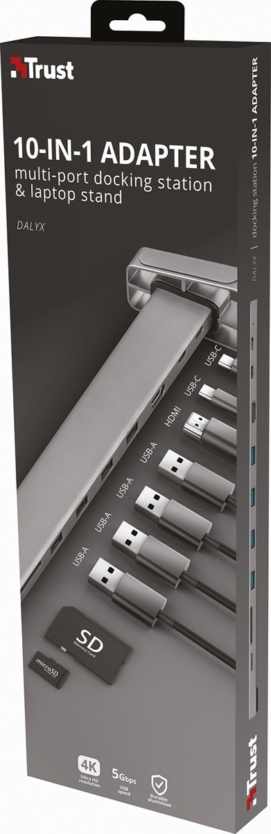 - 10 ports : 4 x USB-A, 2 x USB-C et 1 x HDMI, 1 x Ethernet, 1 x Micro SD et 1 x emplacement pour carte SD