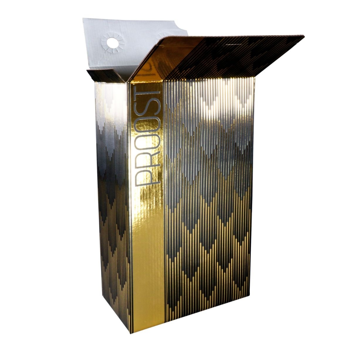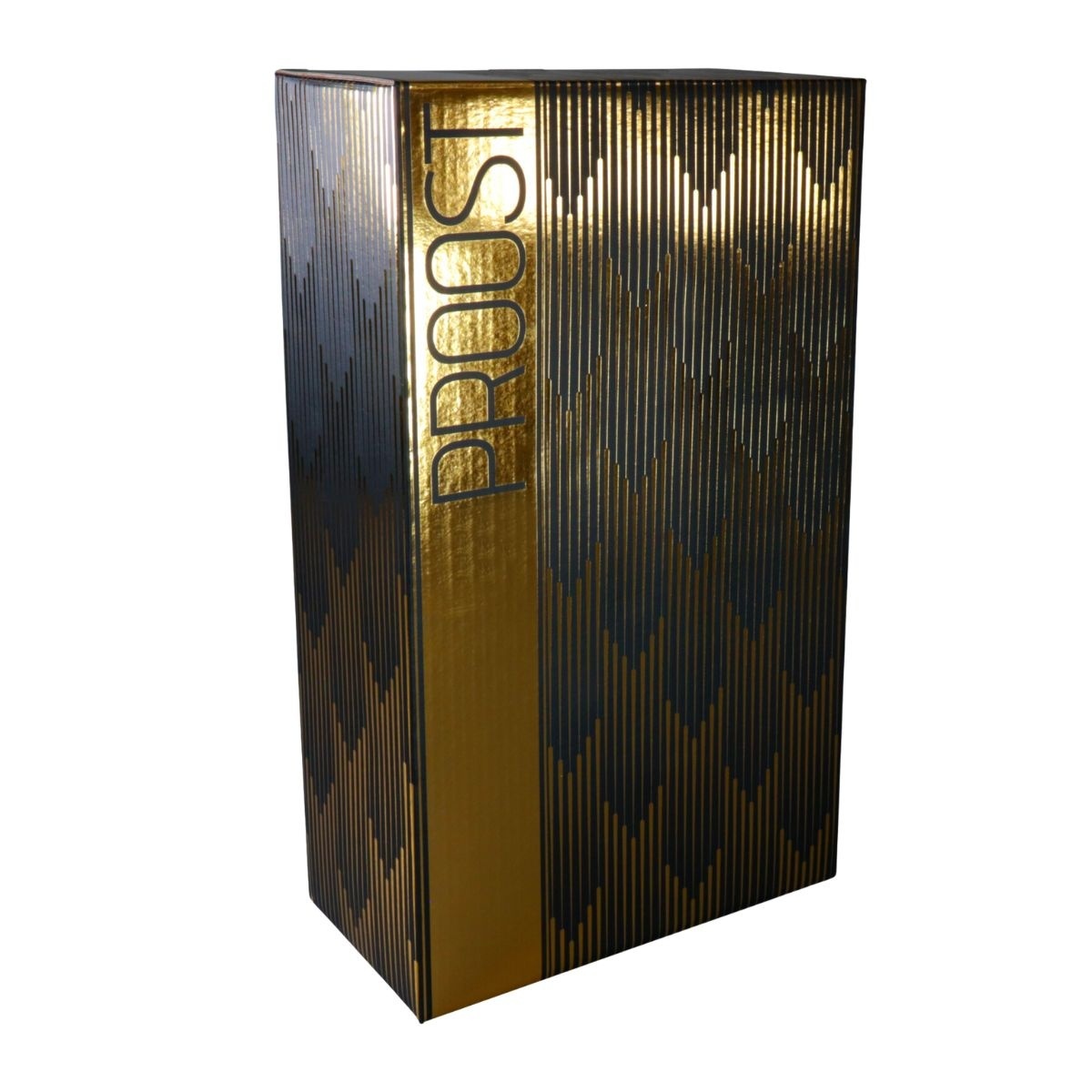 Met de zwart-gouden kleurstelling krijgt de doos een luxe uitstraling die zeker indruk maakt. De zwarte buitenkant en het gouden accent geven een chique en elegante look, ideaal voor presentaties, cadeaus of speciale gelegenheden. Of het nu gaat om het versturen van een cadeau of het presenteren van een wijnpakket in je winkel, deze wijndoos zorgt voor een professionele uitstraling.