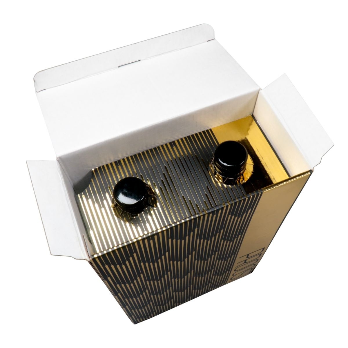 De wijndoos luxe voor 2 flessen is de perfecte verpakking voor het versturen of cadeau doen van wijn. Deze doos is ontworpen om een stijlvolle uitstraling te bieden, terwijl het tegelijkertijd zorgt voor de juiste bescherming van je flessen. Dankzij de combinatie van karton en PE is de doos stevig en heeft het een luxe uitstraling door de zwarte kleur met gouden details. Het is een ideale keuze voor wie op zoek is naar een premium uitstraling voor hun wijnverpakkingen.